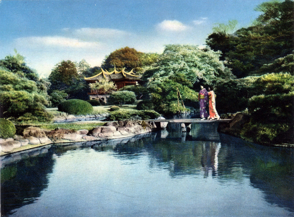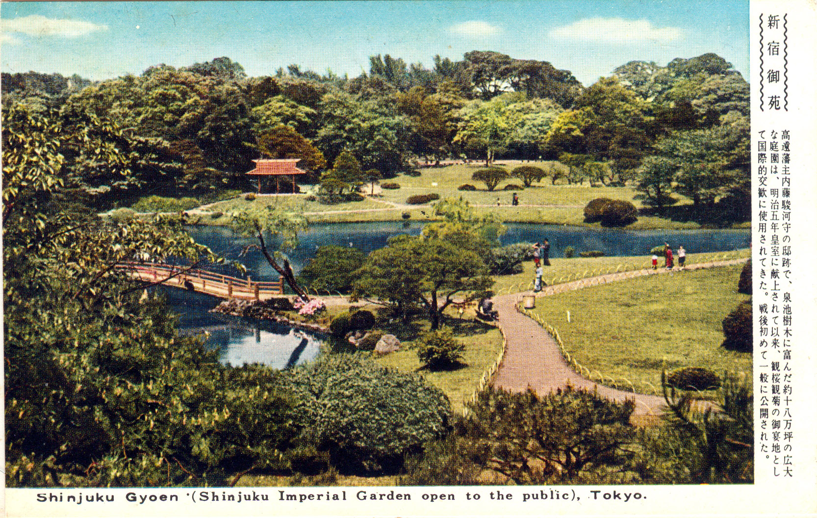 Shinjuku Gyoen (Garden), Shinjuku, c. 1960. The caption reads “The vast garden, with its fountains, ponds, and trees, was presented to the imperial family in 1872, and has been used for international exchanges as a place to view cherry blossoms and chrysanthemums since then. The garden was opened to the public for the first time after World War II.”