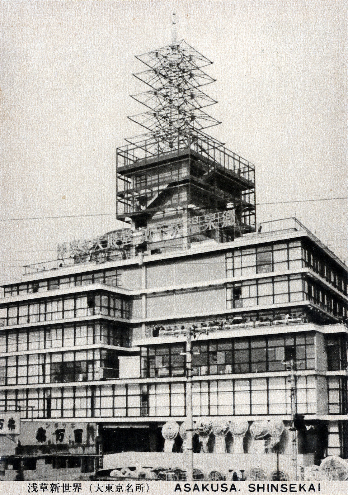 “Shinsekai” (“New World”) under construction, Asakusa, Tokyo, ca. 1959. The seven-story entertainment center opened November 3, 1959, in Asakusa’s historic Rokku district – a significant symbol of Japan’s postwar recovery in an area that had been completely obliterated by wartime firebombings, and topped by a replica of Asakusa’s five-storied pagoda (see below), illustrating the “pious and profane” nature of Asakusa – home to ancient Sensoji temple. Back-caption: “A mammoth entertainment center built in Asakusa’s movie district Roku-ward. It was built on the reclaimed land of Asakusa’s Hyotan Pond, a nostalgic place for the sound of music.”