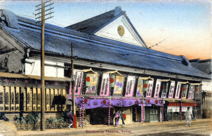 Shintomi-za Theatre (the former Morita-za), Tokyo, c. 1920, constructed in 1878, replaced an earlier kabuki venue that burned down in 1876. Shintomi-za preceded the arrival of its more famous counterpart, Kabuki-za, by over a decade.
