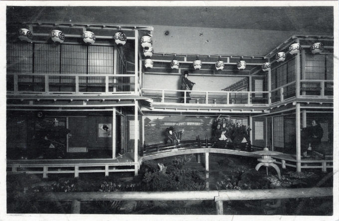 “… Theatre buildings are light and flimsy wooden structures, with straw-mats and matting everywhere. They are all alike — a square auditorium with a sloping floor, a single low gallery, and a stage the full width of the house. The floor space is divided into so-called boxes by low railings, that serve as bridges for the occupants to pass in and out. Visitors always sit on the floor, each box being six feet square and designed for four people … Within the building are booths for the sale of fruits, tea, sweets, tobacco, toys, hair-pins, photographs of the stars, and other notions, so that a box-party need not leave the house in pursuit of any creature comforts. The ventilation is too good, and the light and open construction invites wintry draughts.