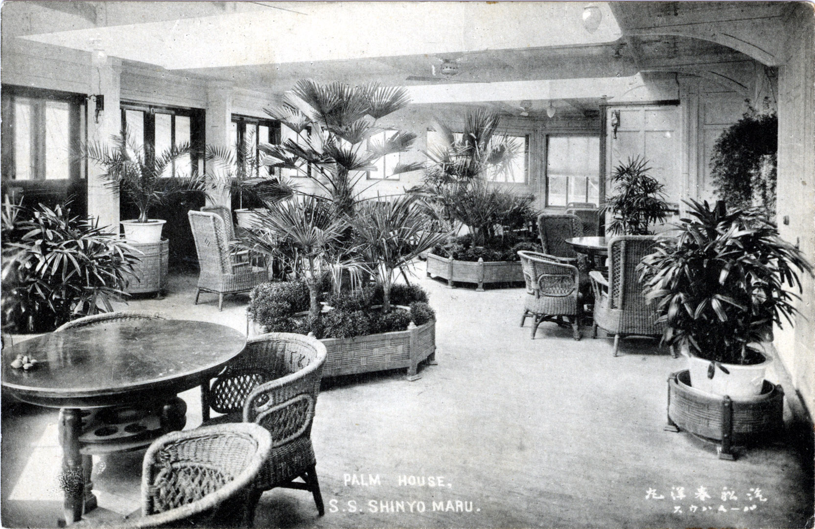 “The Tenyo and Shinyo Maru are sister ships of 22,000 tons displacement. They are driven by triple-screw turbine engines which account for an utter absence of vibration, and a speed of 21 knots per hour .These ships are as finely equipped in every detail as the best first-class hotels on shore, and leave nothing to be desired in service or table. The total length of the deck area measures almost a mile, giving ample opportunity for exercise and promenade.”
