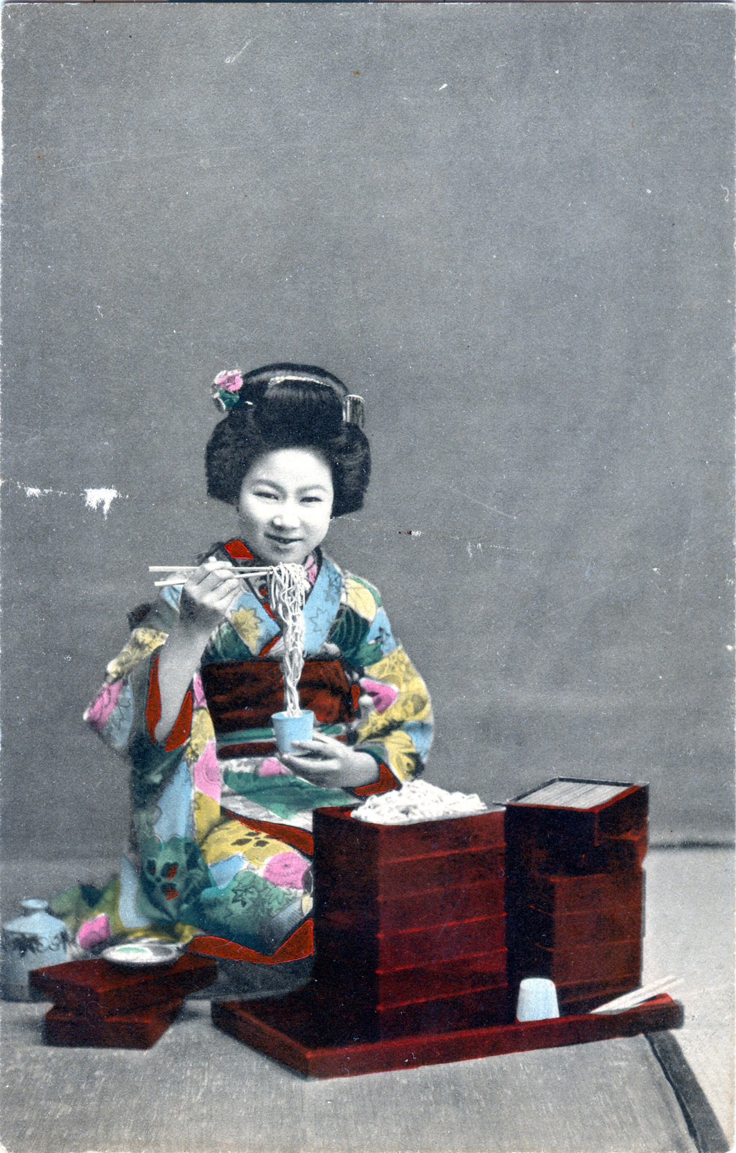 “Maiko eating noodles”, c. 1910, a variety of soba called zaru soba, chilled noodles dipped in soba tsuketsuyu.
