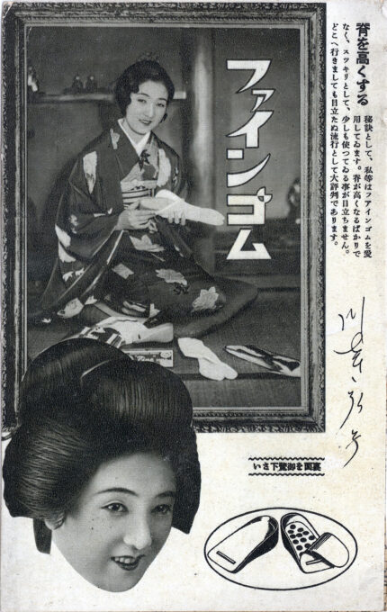 “Stand Tall”, Fine Rubber shoe or zori inserts/lifts advertising postcard, c. 1930, a synthetic rubber product manufactured by the Small Goods Rubber Manufacturing Co., Nihonbashi, Tokyo and sold through a variety of retailers including the Matsuzakaya and Shirokiya department stores “and other haberdasheries”. Endorsing the product on this postcard is Kawasaki Hiroko, a popular Shochiku motion pictures actress in the 1930s. Caption: “The secret is to use Fine Rubber. Not only does it increase your height, but it’s also neat and tidy, and completely invisible. Wherever you go, it’s popular and discreet.”