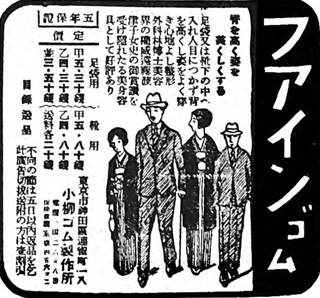 “Fine Gum” newspaper advertisement, Osaka Asahi Shimbun, 1928. for the Small Goods Rubber Co., Nihonbashi, Tokyo. “Slip them into your tabi or socks -— discreet — they protect the heel well and prevent fatigue. Sold in sets of five.”