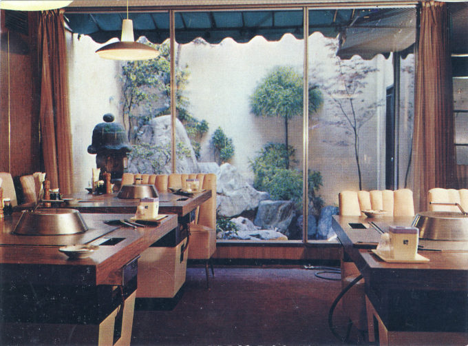 Steak House Akasaka Misono, Akasaka, Tokyo, c. 1970. Fujioka Shigeji opened the world’s first teppanyaki [鉄板焼き, lit. ‘metal plate grilled’] restaurant in bombed-out Kobe in September 1945. This Tokyo location at Akasaka would open for business in 1960. Teppanyaki-style cooking would make its US debut in 1964 when the Benihana restaurant chain first opened its doors in New York City. But Misono still remains the standard by which all other teppanyaki restaurants are measured.