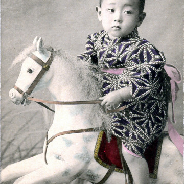 “A Bamboo Horse”, boys on bamboo stilts <span style="font-style: normal;">[takeuma]</span>, c. 1910.