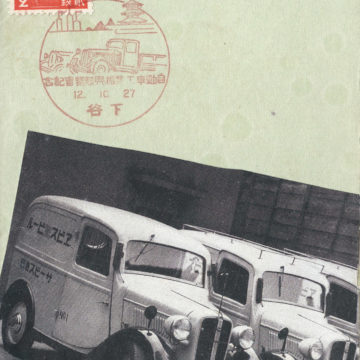 Datsun Type 17T delivery vans, promotional postcard from the Automotive Industry Promotion Exhibition, Tokyo, October 1937.