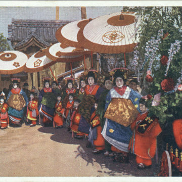 “Kyoto Tayū dochu”. Procession of tayū and kamuro through the “flower town” (hanamichi), Kyoto, c. 1920.