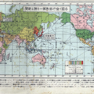 ““Domestic and International Communications Network” advertising postcard, Tokyo Nichi Nichi Shimbun, Tokyo, c. 1940.
