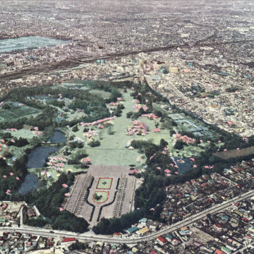 Aerial view of Shinjuku Gyoen and Nishi-Shinjuku water treatment plant, Tokyo, c. 1960.