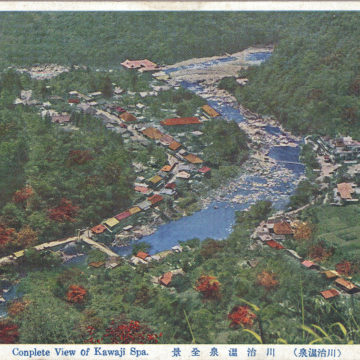 “Hotels seen on side of fine stream”, Kinugawa Onsen District, Nikko, c. 1930.