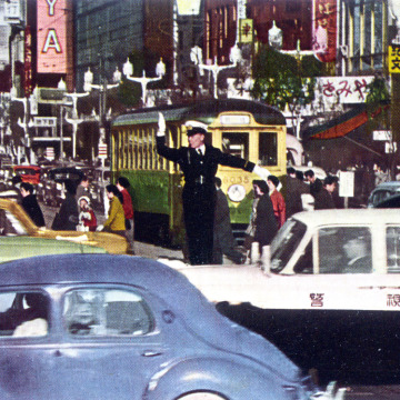 Ginza Crossing streetcars, Tokyo, c. 1960.