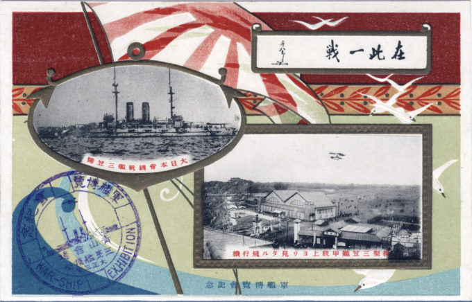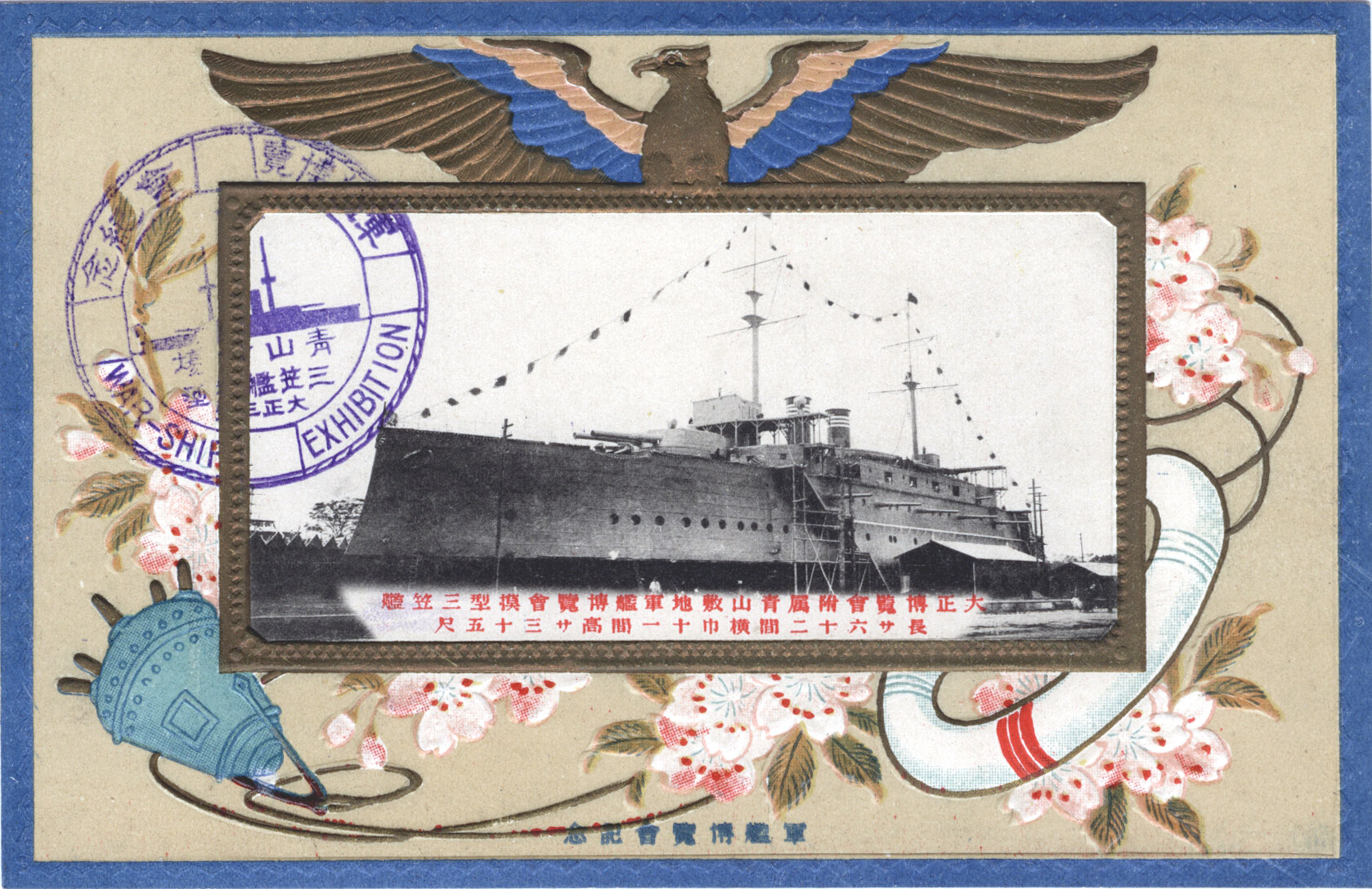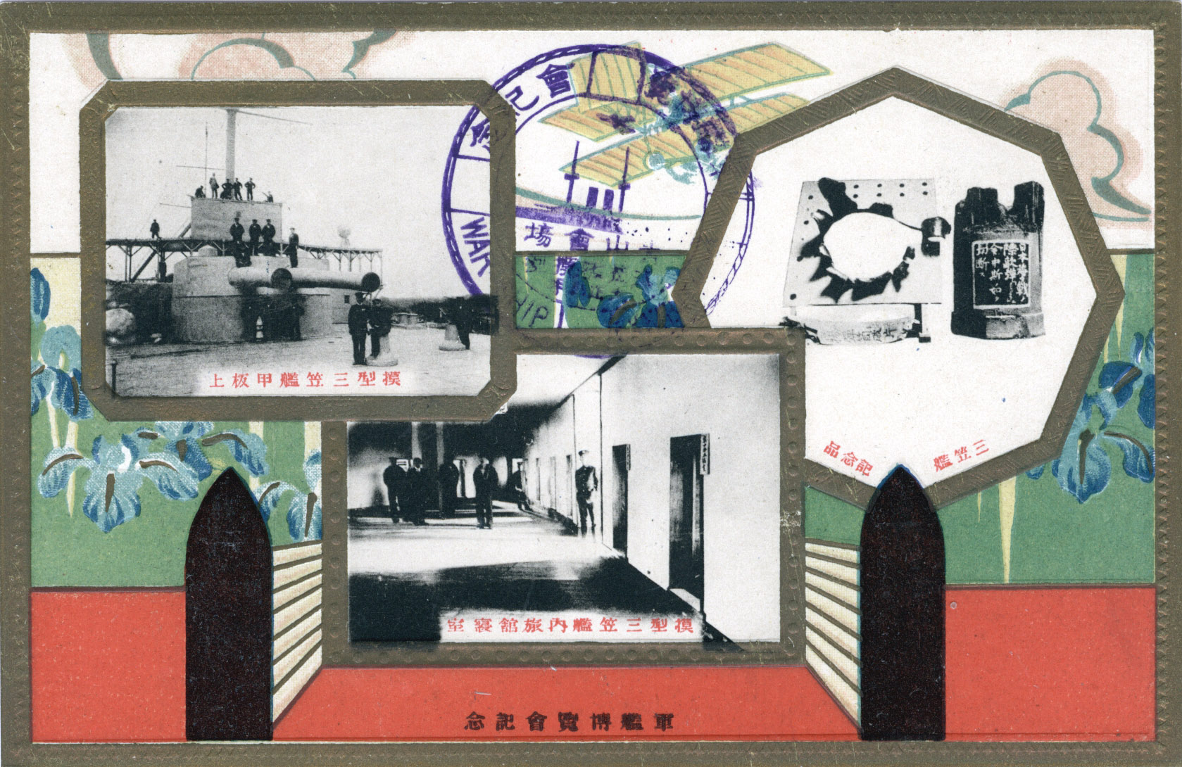 - The “War-Ship Exhibition” at the Taisho Exhibition, Ueno Park, Tokyo, 1914. Photo inset: The battleship Mikasa.