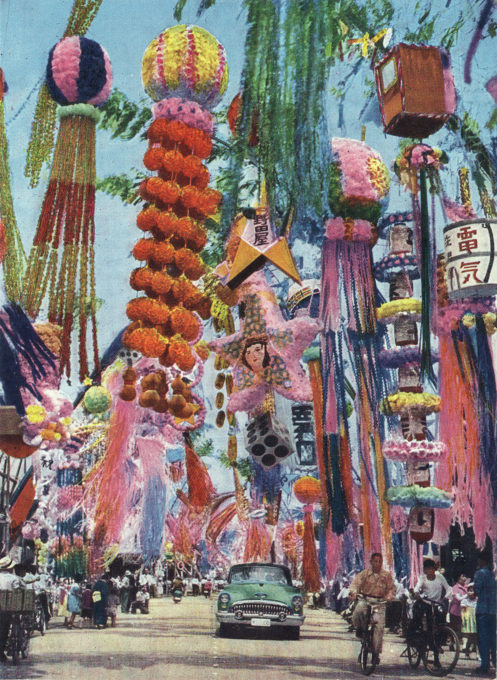 “Tanabata Festival (Tradition of the Milky Way)”, c. 1940. The inset caption reads “The summer night breeze flutters down the seven-colored streamers.” Tanabata-matsuri is observed annually every July 7th.