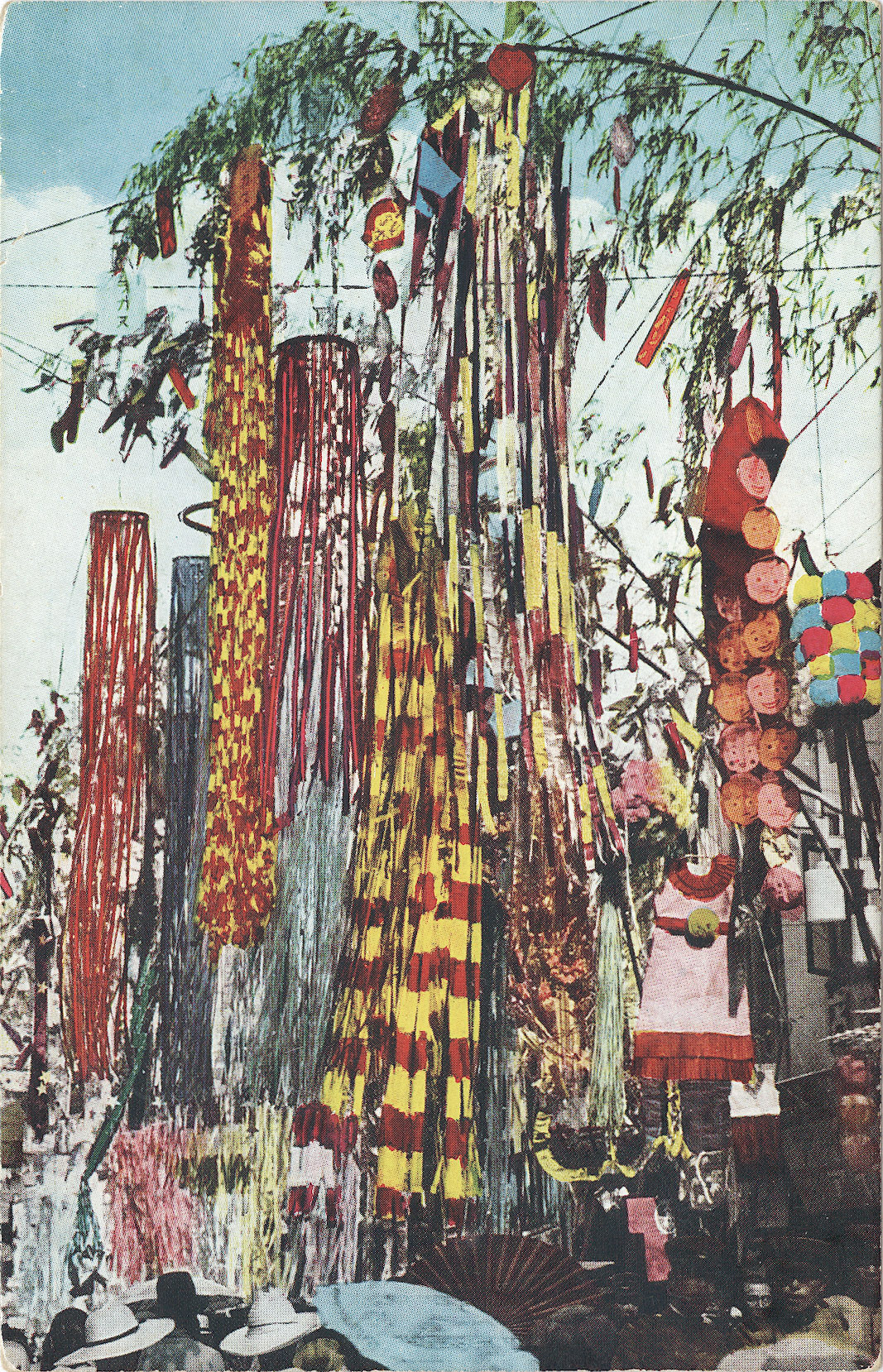 “Bamboo trees are set up in front of the houses or before garden shrines and to their branches are hung poems on the love theme of the festival, also papers cut in the shape of kimono (as a tribute to the weaver princess), and to represent cows (for the herder) also threads of five colors: green, red, yellow, white and black (or purple). Melons, peaches, egg-plant and other fruit and vegetables, cakes and sweetmeats are likewise offered.”