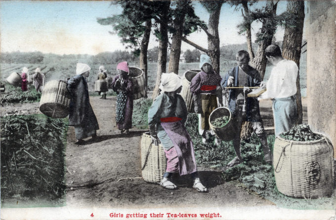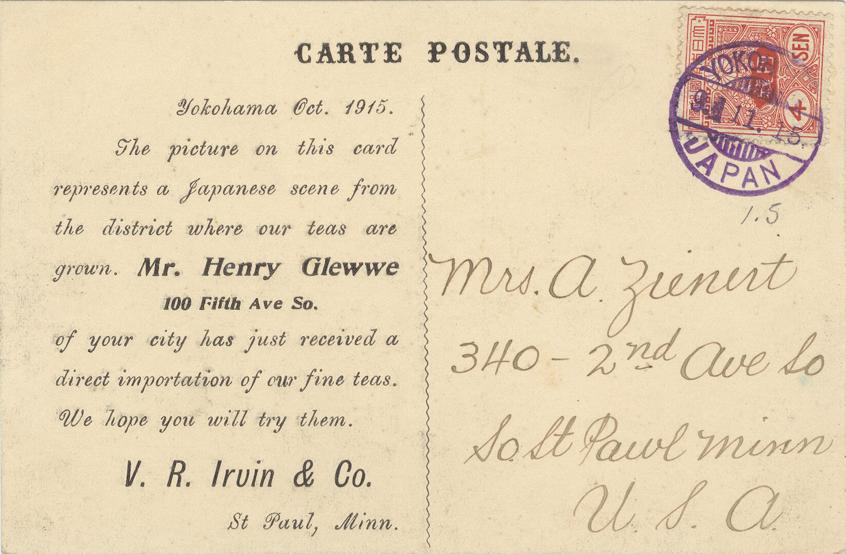 Reverse side of a US Midwestern tea importer’s advertising postcard, 1915. The front image was of tea pickers in Uji, Japan’s top tea-production district responsible (at the time) for 1/3rd of the country’s tea production.