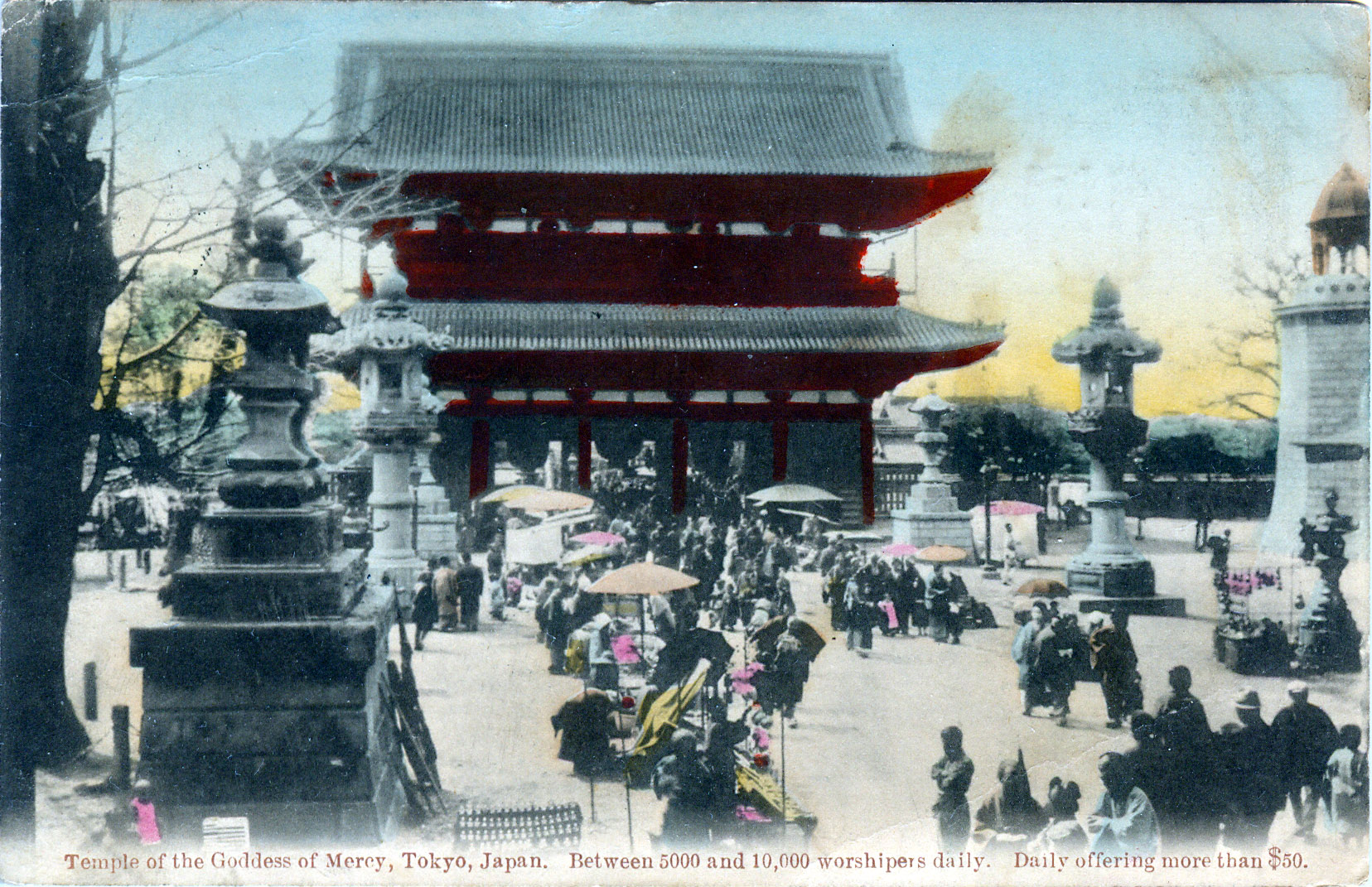 Temple of the Goddess of Mercy, Tokyo, Japan, c. 1910. “Between 5000 and 10,000 worshippers daily. Daily offering more than $50” (equivalent to $1200 in 2014 dollars).