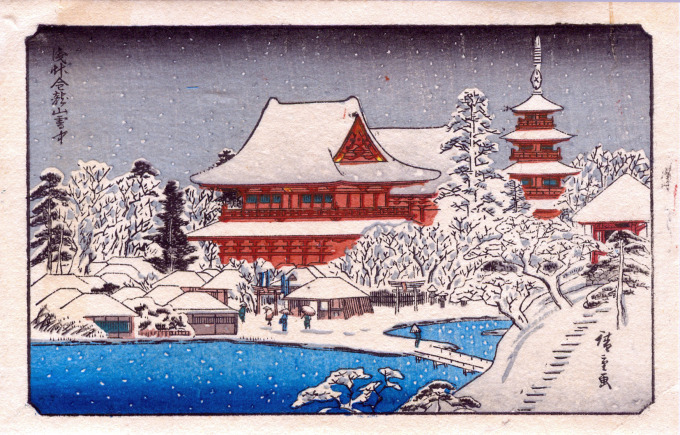 Postcard reproduction, c. 1940, of Hiroshige’s “The Kinryuzan (Sensoji) Temple at Asakusa in the Snow” (Famous Places in Edo series, c. 1843-1845) and the Five-Storied Pagoda.