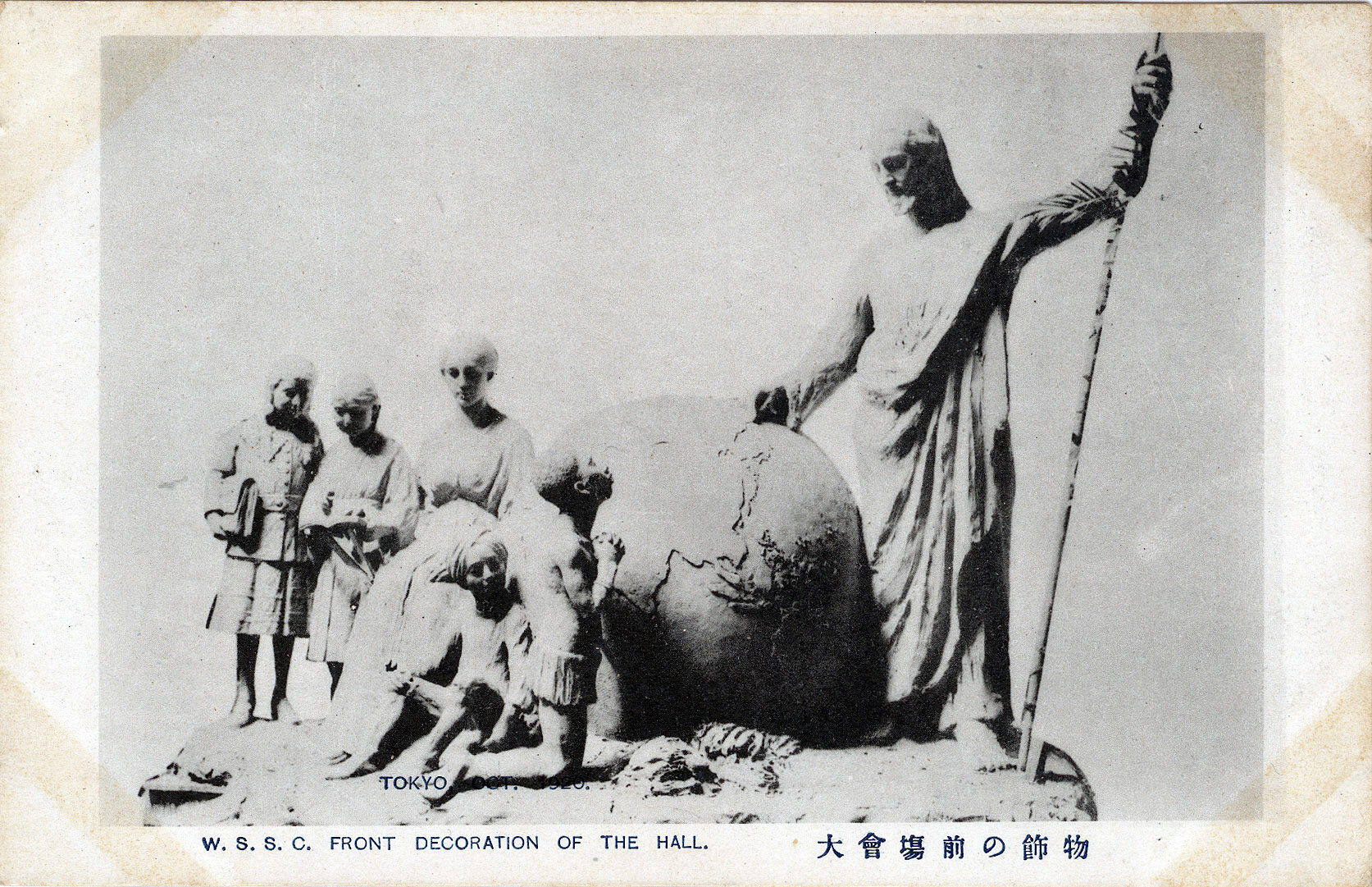 “On Tuesday, October 5, many delegates to Tokyo stood in admiration before that triumph of the energetic purpose of the Patrons’ Association and the Christians of Japan, the great Convention Building. They gazed at the beautiful white gypsum statue before the building, which represented Christ (with his hand on a large globe) Blessing the Children of the World, representatives of whom were gathered with the teacher on the opposite side of the globe. They wandered into the corridors and the offices, spoke appreciatively of the comfortable rest rooms and other arrangements for the pleasure of the delegates, then took seats in the great hall and looked toward the platform where places had been arranged for a thousand participants in the pageants for which plans had been made.
