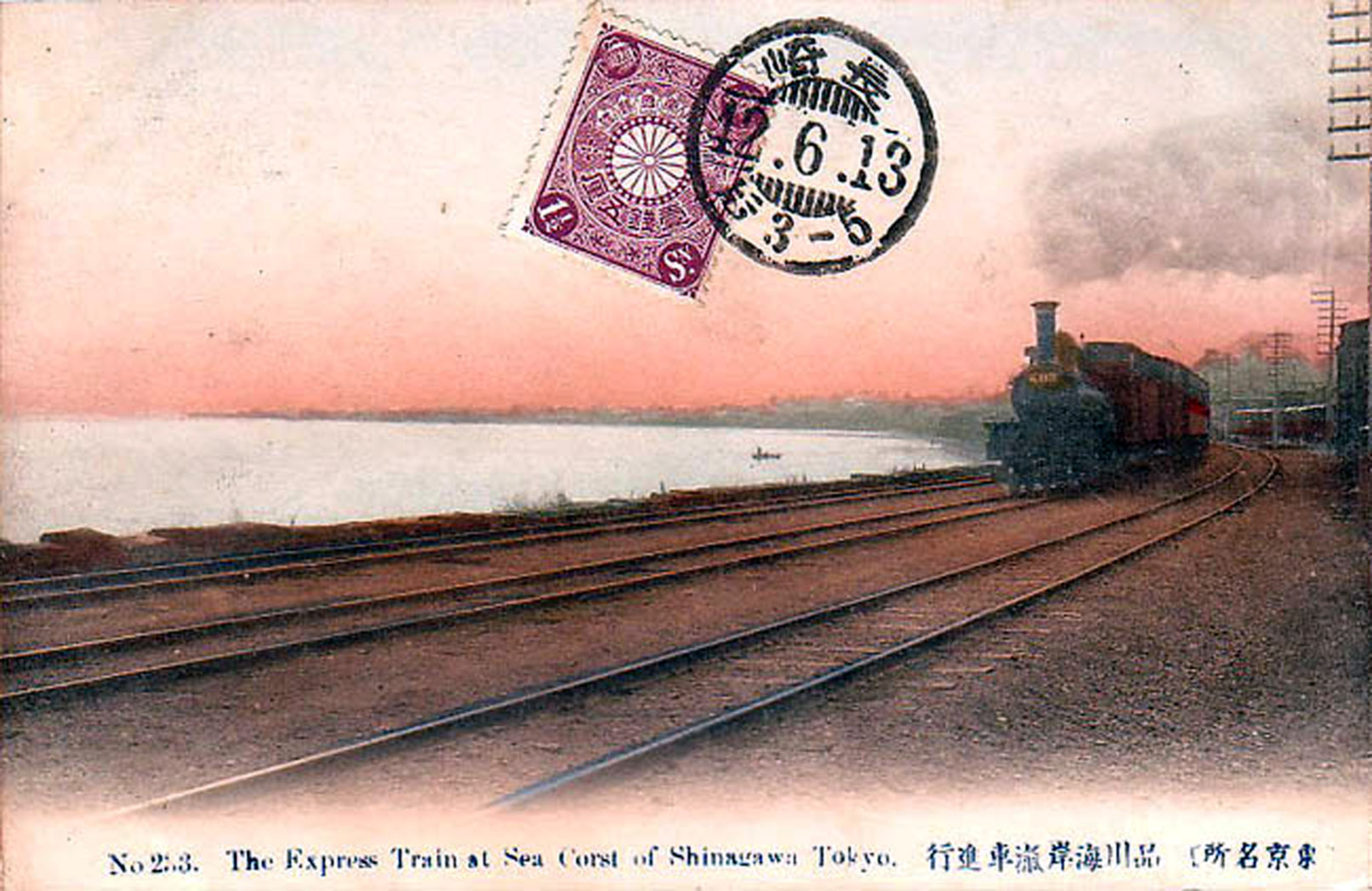 “The Express Train at Sea-Coast of Shinagawa,” 1912. The Tokaido Main Line crosses into Tokyo from Yokohama.