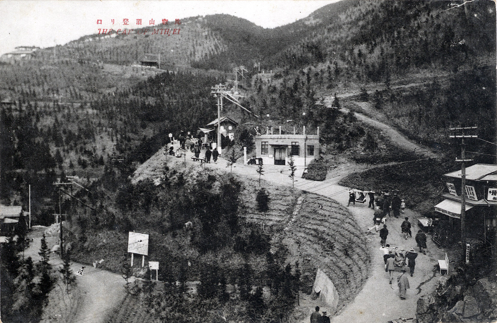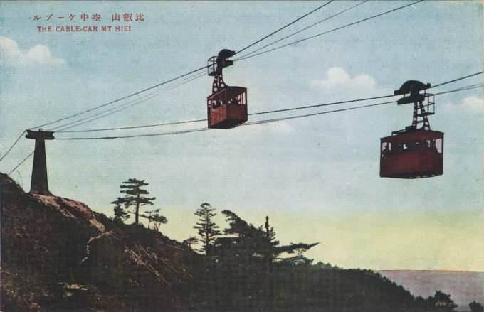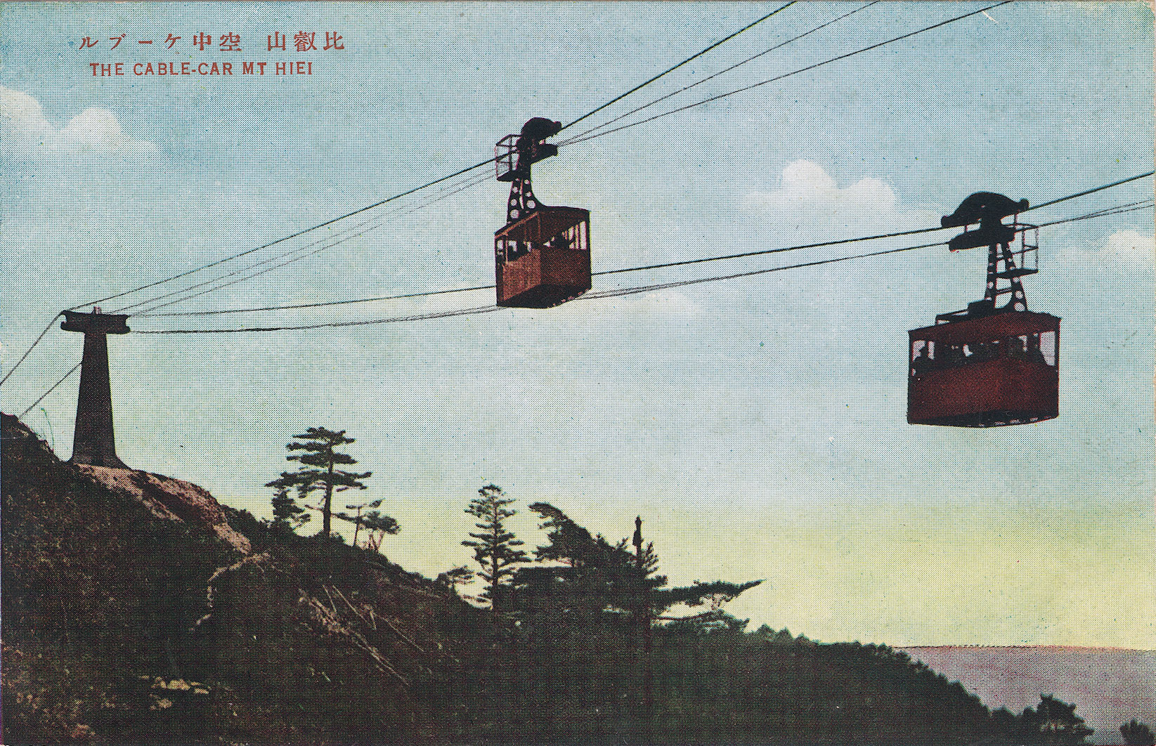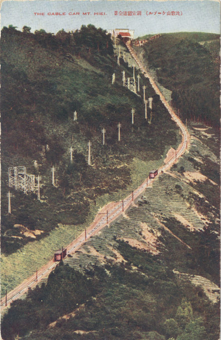 “The Cable Car Mt. Hiei”, Kyoto, c. 1930, the steepest in the country, extends only about halfway up the mountain. To reach the monastery and temples closer to the summit, a further trek on foot or by litter was required (until completion of a ropeway in the 1930s).