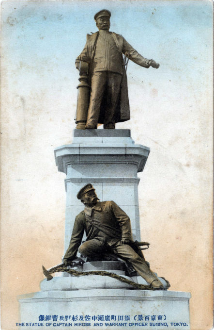 “When the vessel was about to drop anchor, Sugino descended into the hold to ignite the explosives, when the enemy’s torpedo struck the ship and killed him. Commander Hirose, when the crew had got into the boat, not seeing Sugino, searched through the ship. The sinking ship compelled him to take to the boat, and as they were retreating, a missile struck the Commander on the head, carrying his body overboard and leaving nothing behind but a piece of flesh.”