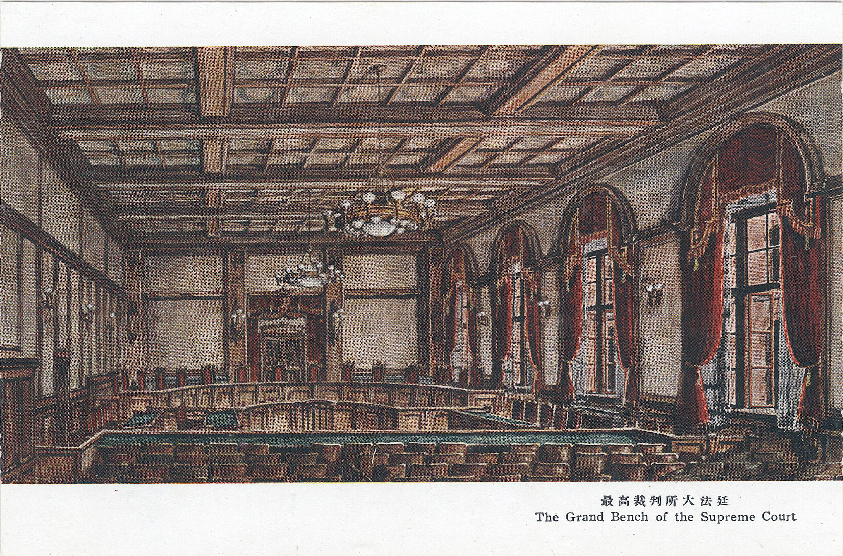 “The Grand Chamber of Justice”, Supreme Court, Tokyo, c. 1930. In session, the Grand Chamber was composed of 1 Supreme Court Chief Justice and 14 Supreme Court Justices to render decisions.