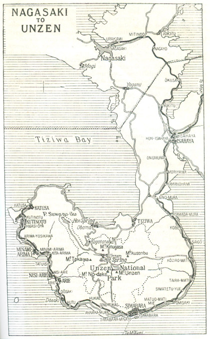 “Unzen is the collective name of the three hamlets of Furu-Unzen, Shin-yu, and Kojigoku, lying near the wonderful solfatra of Ojigoku in a hollow of the range called Unzen-take. Each hamlet stands about 10 min. from the other.