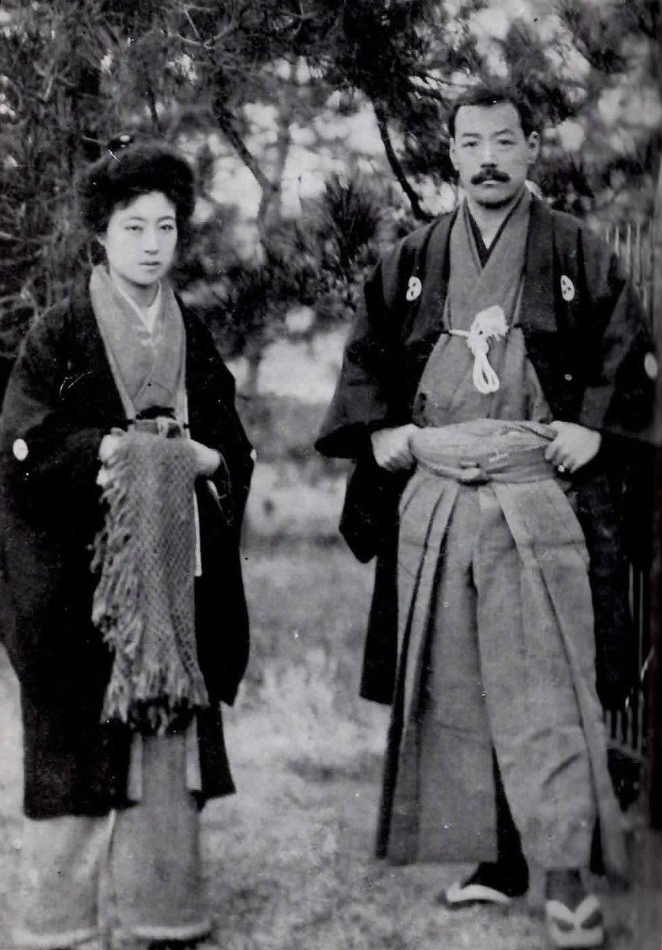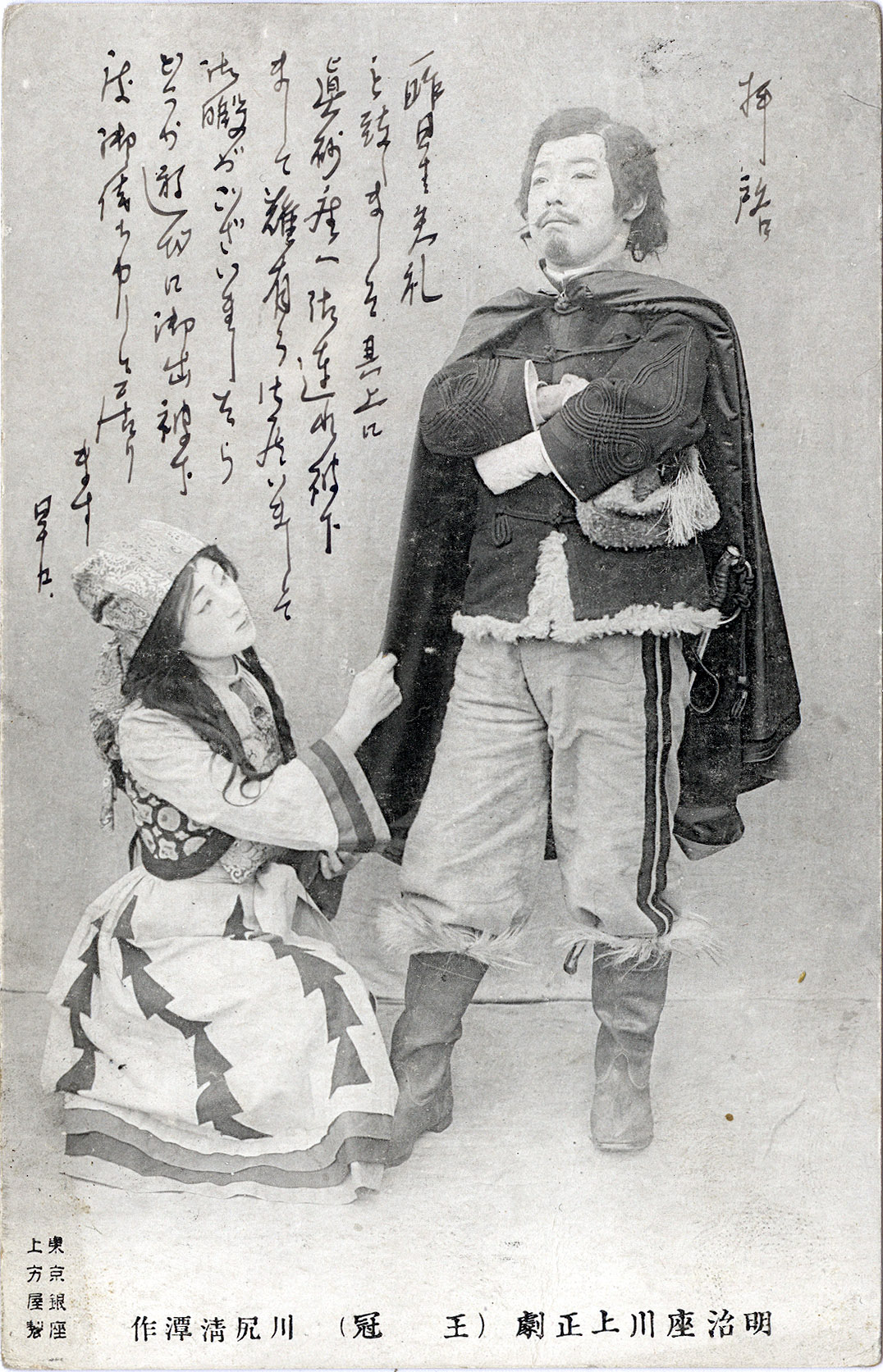 The Kawakami Theater (Kawakami Otojiro and his wife, Sadayakko aka Sada Yacco) performing “Ōkan” [王 冦, “bandit crown”] at Meiji-za Theater, c. 1905. “Okan” was Kawakami’s interpretation of Francois Coppée’s Pour la couronne (“For the Crown”), first staged in Paris in 1895. Over the course of their marriage and careers, Kawakami, a founder of Japan’s shinpa [“new school” theater], and Sadayakko, considered to be Japan’s first actress, would cross paths with several prominent Japanese aristocrats and politicians who would become patrons and benefactors … and even omiai (“matchmaker”).