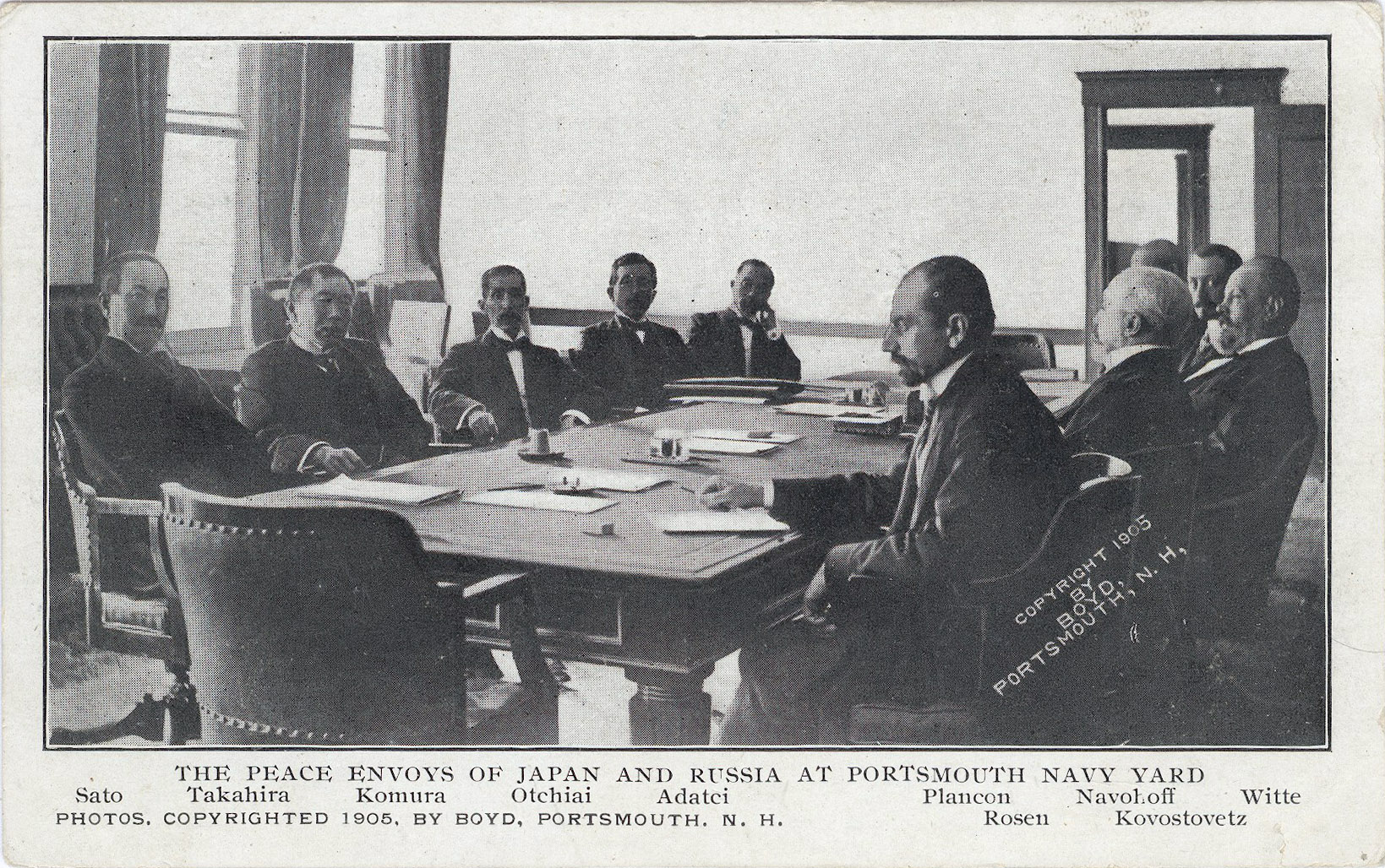 “The peace envoys of Japan and Russia at Portsmouth Navy Yard”, 1905. The Japanese delegation was led by Foreign Minister Komura Jutarō; the Russian delegation led by former Finance Minister Sergei Witte. Negotiations between the two countries began August 9, 1905, with U.S. President Theodore Roosevelt acting as the organizer and the mediator, a role for which he would subsequently win the Nobel Peace Prize, and concluded on August 30, with the Treaty of Portsmouth formally signed on September 5, 1905.