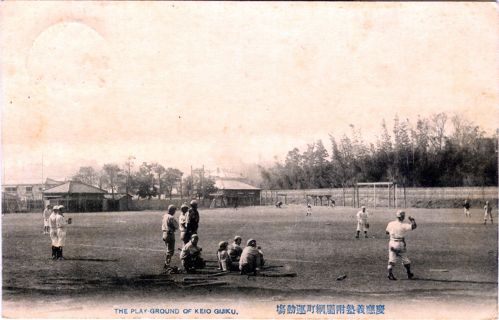“The Play Ground of Keio Gijiku [sic]”, Tokyo, c. 1905. Keio University fielded one of the first baseball teams in Japan, around 1900, and began a rivalry in 1903 with Waseda University that continues to this day … except between 1906-1925 when the Sokeisen (“war between Keio and Waseda”) was banned because of “overly rowdy team behaviors.”