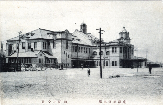 “The second Kyoto Station [seen in the postcard images] was built in 1914 to coincide with the enthronement ceremony of the new Emperor Taisho in Kyoto Imperial Palace. This building was an elegant and spacious Renaissance style structure and considered an object of pride by the national railway.