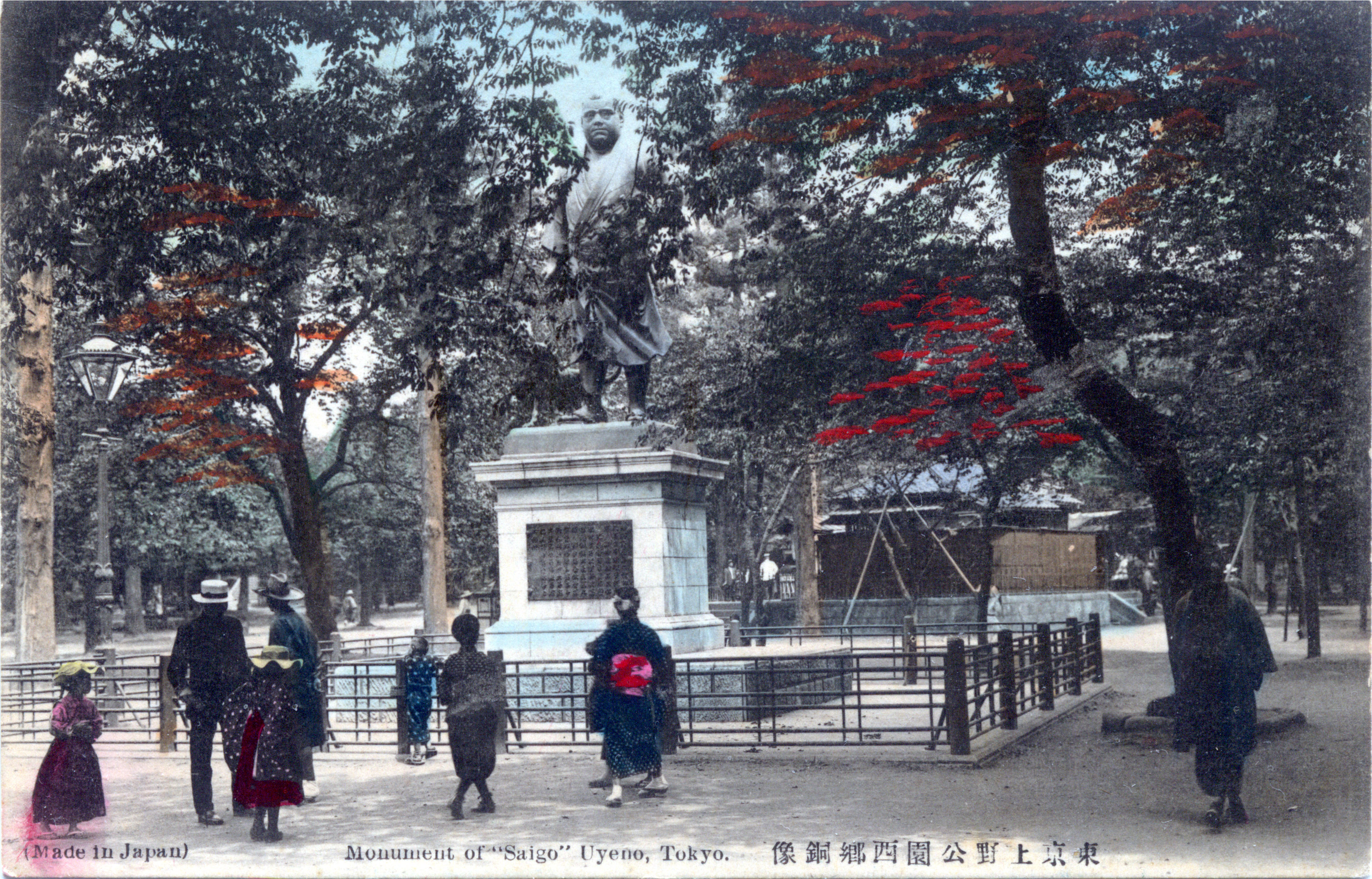 “The Statue of Saigo at Ueno Park”, Tokyo, c. 1910. Saigo Takamori is often referred to as the “Last Samurai“. He commanded the Imperial army that defeated Tokugawa forces in the Boshin War. A decade later, though, he (reluctantly) led an insurrection against the imperial government – the Satsuma Rebellion – that ended in defeat and his death.