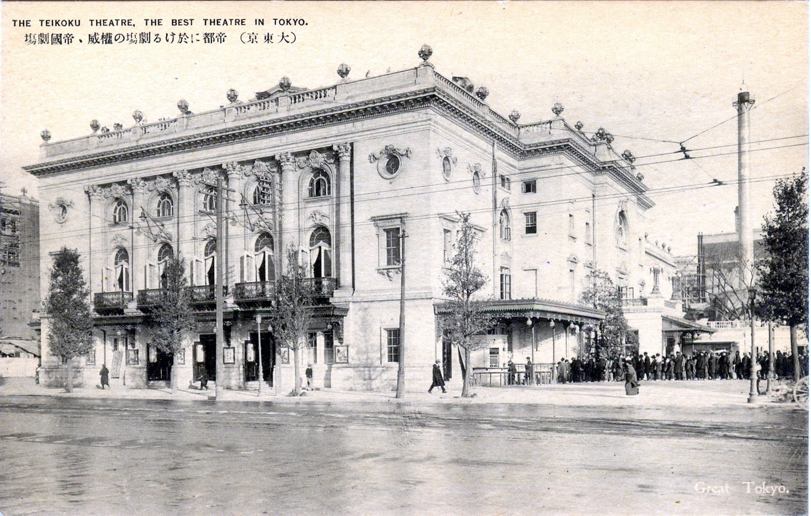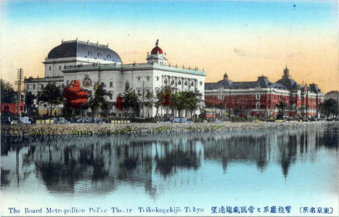 The Teikoku Gekijo Kaisha [Imperial Theatre Company] was founded in 1910 with the purpose of building Japan’s first Western-style theater and producing the country’s first non-Japanese theater programs. The result was the Teikoku Gekijo [also known as Teigeki] completed in 1911 on land directly across from the Imperial Palace plaza in the Marunouchi district. The four-story building was designed in a Renaissance style by Yokogawa Tamisuke (1864–1945), a renowned architect (and founder of Yokogawa Electric Co. in 1915) who was also responsible for the design of the Mitsukoshi department store completed in 1915.