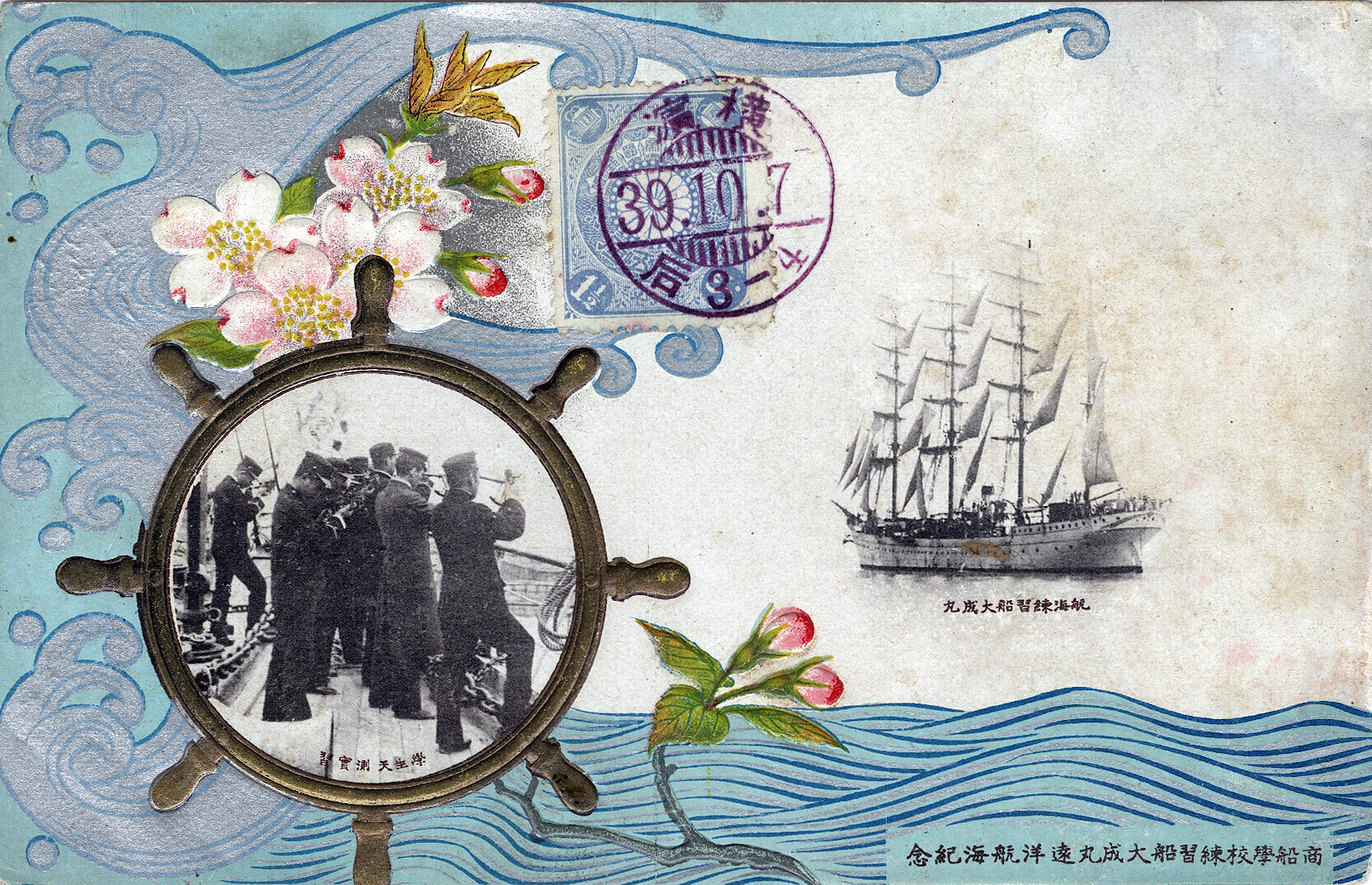 Cadets learning to use nautical telescopes during a training voyage on board the Tokyo Nautical School training ship “Taisei Maru”, 1906. The Nautical School originated in 1875 as the Mitsubishi Merchant Navigation School established in Nagasaki by the Mitsubishi Shokai, predecessor of the NYK (Nippon Yusen Kaisha) shipping company. It was converted seven years later into a government-run institution. Graduates of the Nautical School became merchant marine officers of the highest caliber educated in both nautical engineering and in the art of navigation, and also served in the Naval Reserve.