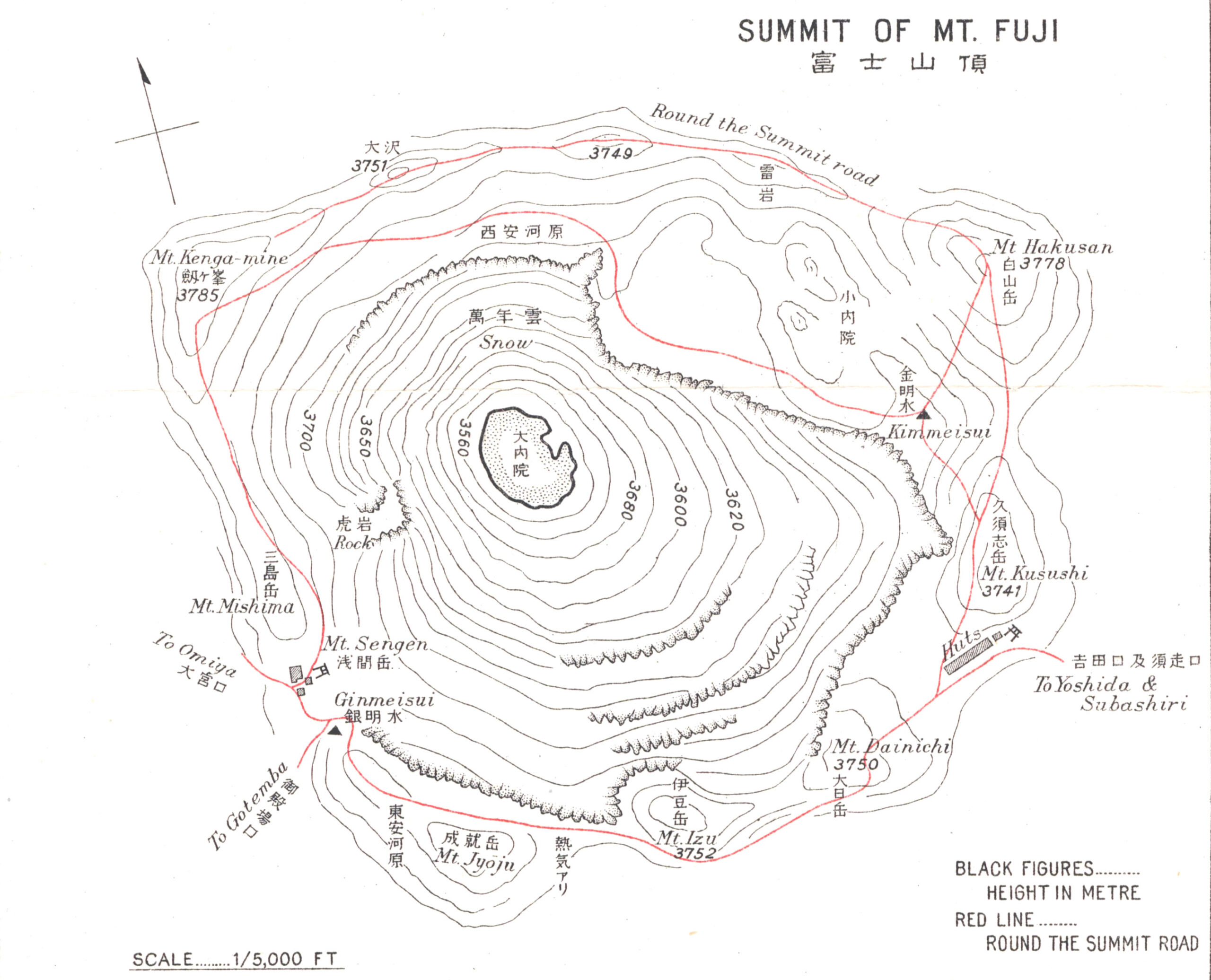 “There are five approaches to the mountain, from Gotemba and Subashiri (east), Yoshida (north), Ōmiya (west), and Suyama (south). Coolie-guides, called gōriki, may be engaged at any of these places. Chairs and horses are available for some distance from all points.
