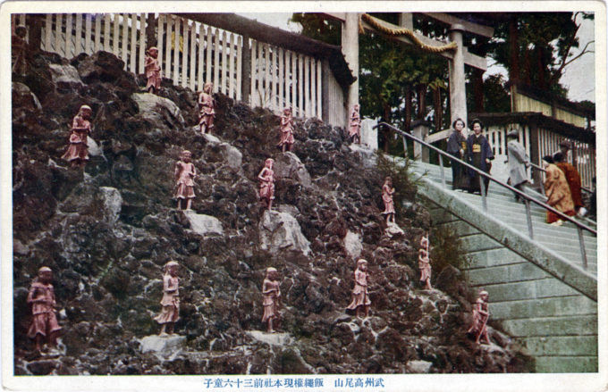 “Thirty-Six Children beside the steps to the Head Temple”, Mt. Takao, Hachioji, Tokyo, c. 1930. Cast statues of children are arranged alongside the steps up to Yakuoin Temple.