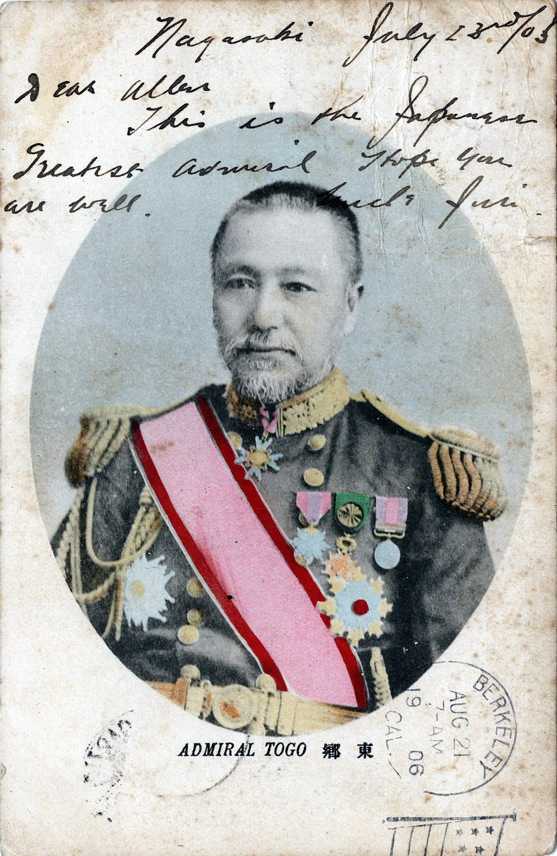 “This is the Japanese greatest admiral …” Admiral Togo, 1906, gensu [Admiral] of the fleet of the Imperial Japanese Navy, and one of Japan’s greatest naval heroes. During the Russo-Japanese War of 1904–1905, he successfully confined the Russian Pacific naval forces to Port Arthur before winning a decisive victory over a relieving Russian Baltic Fleet fleet at Tsushima in May 1905. Western journalists called Tōgō ‘the Nelson of the East’.