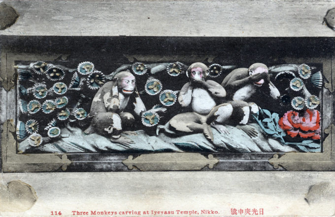 “Three Monkeys carving at Iyeyasu Temple”, Nikko, c. 1920.