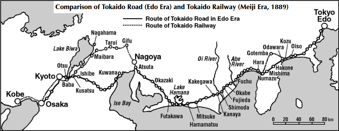 Comparison of the Tokaido Road (Edo period) and the Tokaido Railway (Meiji period). [Source: Japan Railway and Transport Review.]
