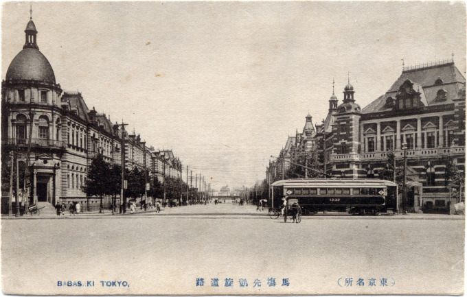 The west end of Marunouchi “Londontown”, across from the Imperial Palace plaza at Babasaki, Marunouchi, Tokyo, c. 1920. The Tokyo Chamber of Commerce is at right, designed by Dr. Yorinaka Tsumagi and completed in 1899. The round rotunda building at left was the first headquarters of the Meiji Life Insurance Co. Tokyo’s Chamber of Commerce was organized in 1890 by Baron Shibusawa Eiichi, considered to be Japan’s “Father of Capitalism”. Shibusawa had previously founded Japan’s first modern bank and the Tokyo Stock Exchange, and was also the founder of or a substantial investor in hundreds of other companies including Sapporo Breweries, N.Y.K. Lines, Tokyu Corporation, Tokyo Gas, and the Imperial Hotel.