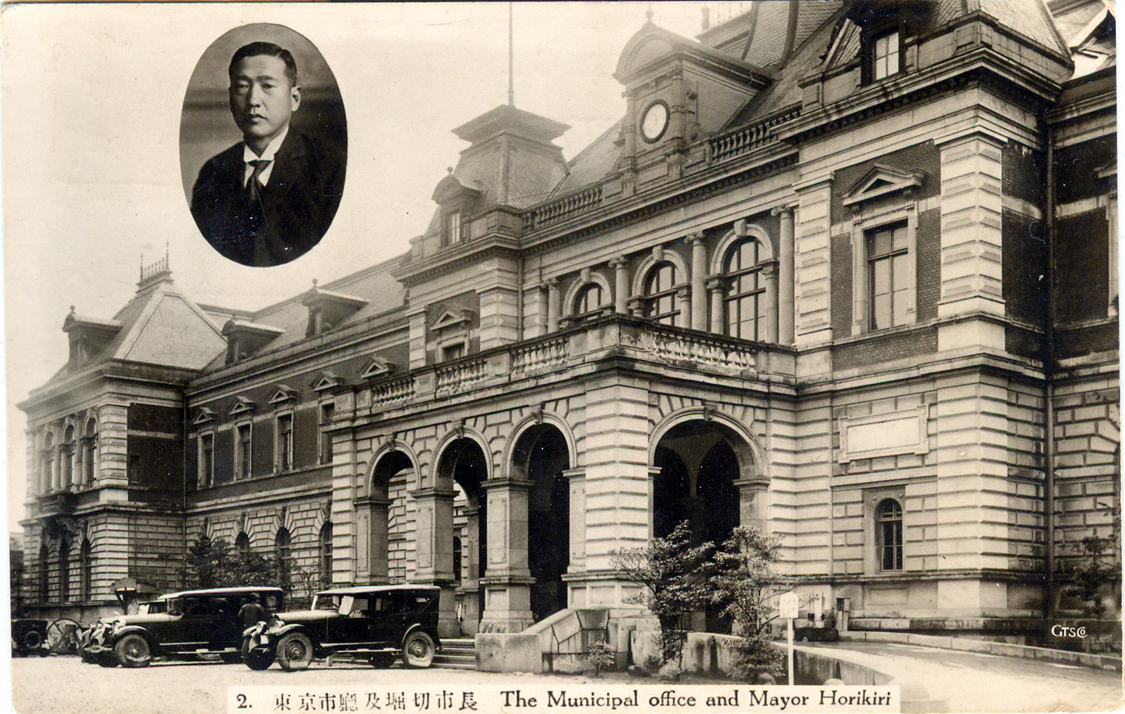 Exterior of the Tokyo Municipal Office (City Hall), c. 1930, with an inset photo of Mayor Horikiri Zenjiro (1929-1930). Prior to his appointment as mayor, Horikiri was the Director of the Reconstruction Bureau, which was in charge of urban planning and the rebuilding of Tokyo in the aftermath of the Great Kantō earthquake.