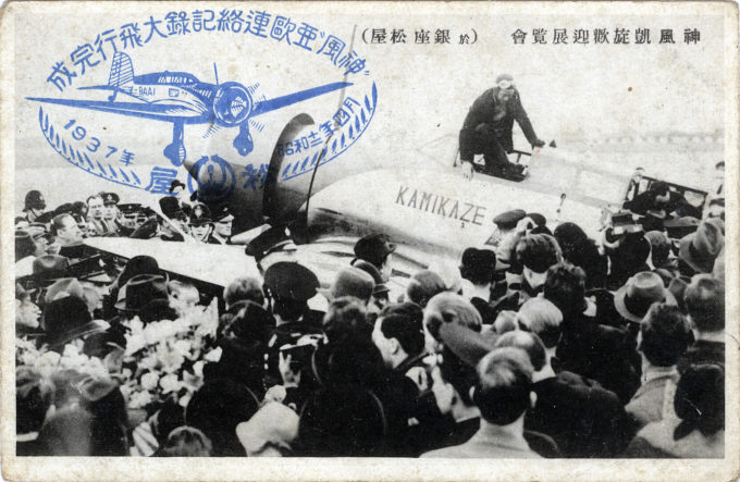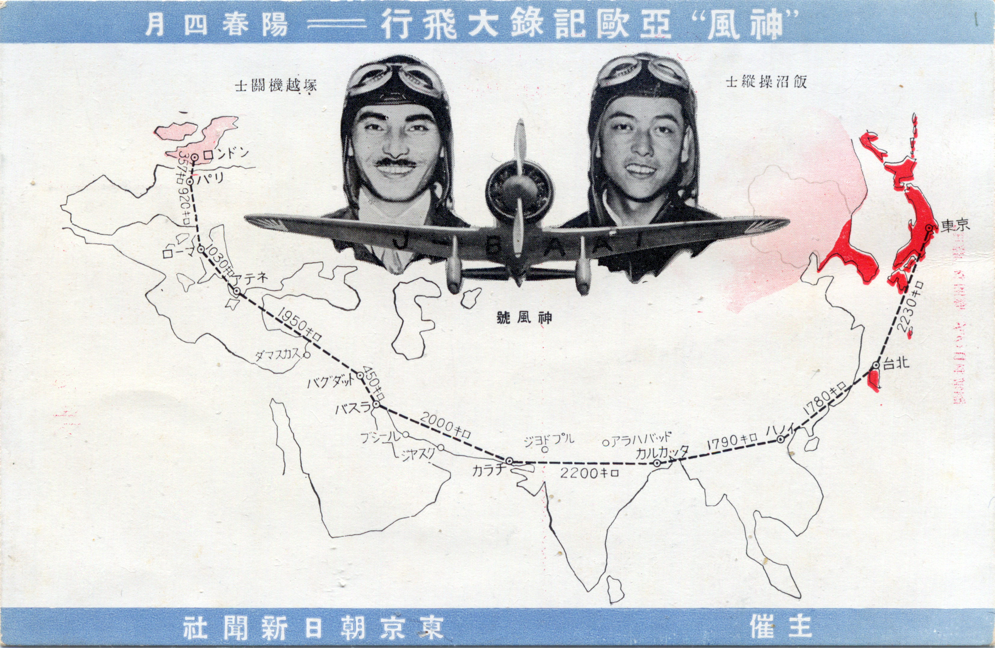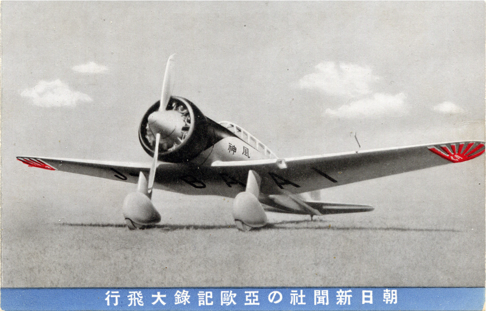 “The Kamikaze-go, a Mitsubishi Ki-15 Karigane aircraft (registration J-BAAI), sponsored by the newspaper Asahi Shimbun, succeeded where others failed. Flight-time from Tokyo to London took 51 hours, 17 minutes and 23 seconds, piloted by Iinuma Masaaki (1912–1941) with Tsukagoshi Kenji (1900–1943) serving as navigator. The flight was the first Fédération Aéronautique Internationale aviation record to have been won by the Japanese.