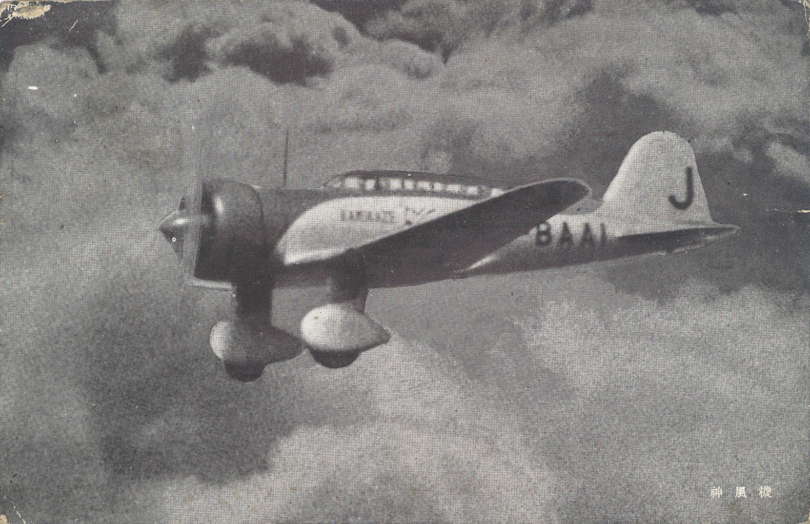 Promotional postcard published by the The 5th All Japan Student Aviation Championships, 1939. Despite being built as the second prototype of the Ki-15 flight reconnaissance class and touring the country after its world record flight, Kamikaze-go would be called to active duty during the Second Sino-Japanese War performing its reconnaissance role until the Ki-15 reached full factory production, at which time Kamikaze-go became a trainer. A flight accident ended its Army career. The aircraft was restored by its original owner, Asahi Shimbun, resuming its role as company flagship, before a second accident rendered Kamikaze-go unairworthy. Kamikaze-go survived the Pacific War as a museum piece but was later burned as war material by Occupation troops.