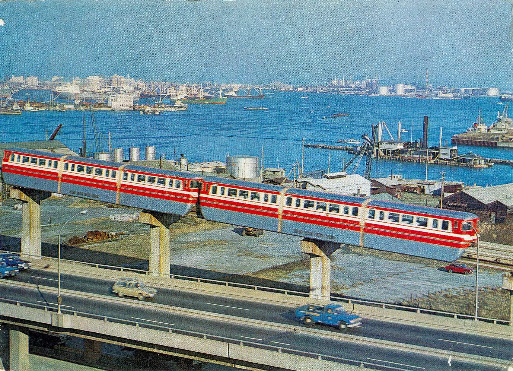 The Tokyo Monorail skirting Tokyo Bay near Shinagawa, 1964. Reverse caption: “The ‘Smart Car’ is attracting attention as the world’s first commercial vehicle with a single-track, fast speed, and the ability to travel from Haneda to Hamamatsucho in just 15 minutes (maximum speed of 100 km/h).”