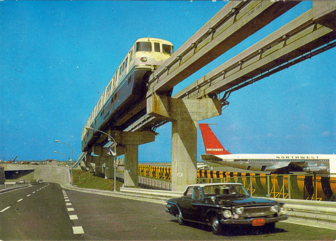 - Tokyo Monorail departing Haneda (Tokyo International) Airport, c. 1965. A Northwest Airlines “travel” postcard. In the foreground is a 1962 Plymouth Fury sporting an orange US diplomatic license plate.