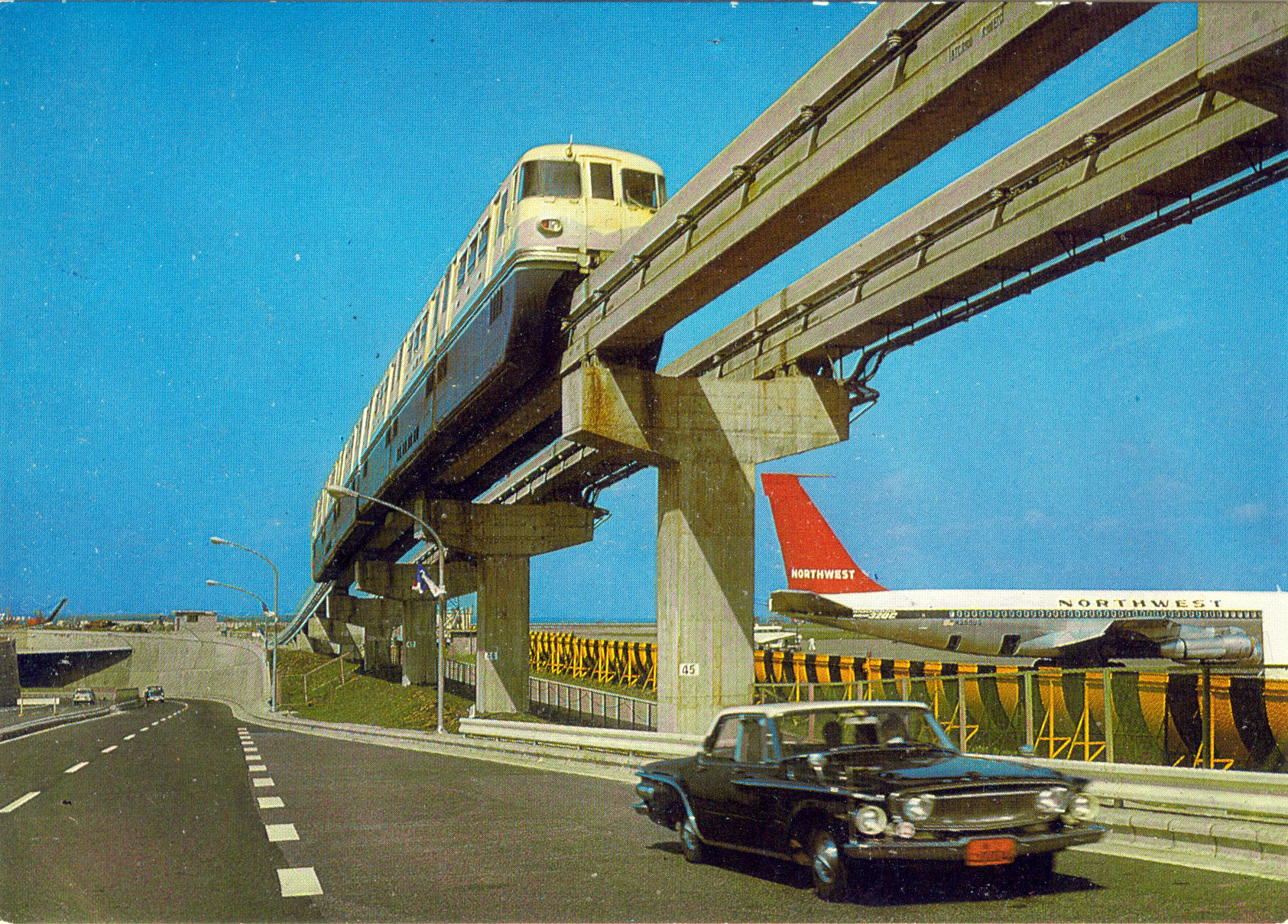 “Monorails were a futuristic mass transit concept designed to use urban air space and leave the ground to vehicular traffic. The first permanent monorail was put into operation as part of Disneyland’s theme park, in 1956, followed in 1957 by the opening of a short monorail track at Tokyo’s Ueno Park. Seattle constructed a monorail for use during its 1962 World’s Fair.