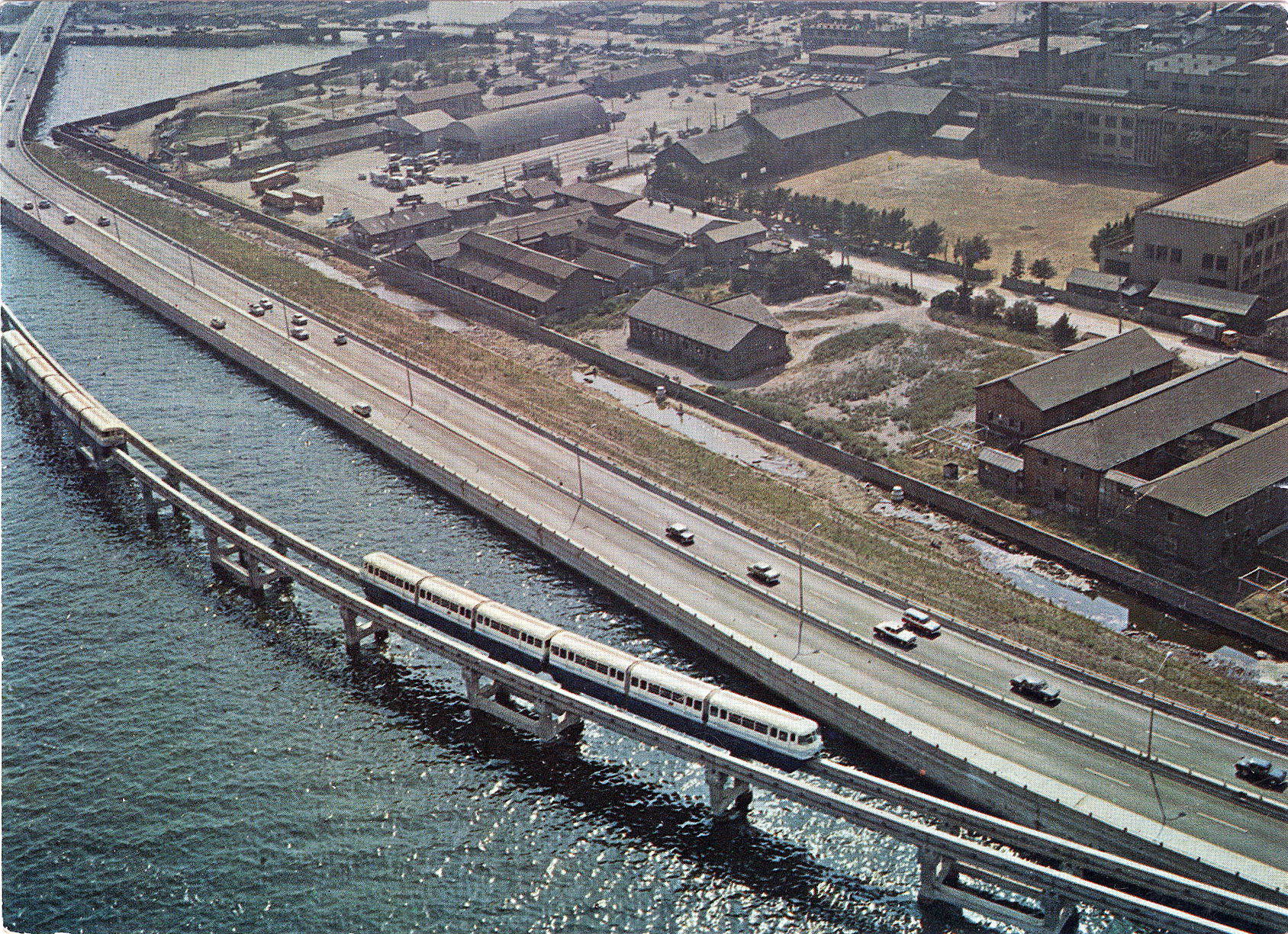 “The line was originally planned to extend from Haneda to Shimbashi or Tokyo stations. Cost overruns for the national railway’s Tokaido Shinkansen project shortened the monorail route. As a cost-saving move, the route was built largely over water with the elevated track following the coast line. The resulting construction eliminated a number of fishing and aquatic farming operations. In particular, the Omori no nori sea field in Ota Ward at Shinagawa, which had produced a premium brand of nori [seaweed] since the Edo Period, was destroyed.”