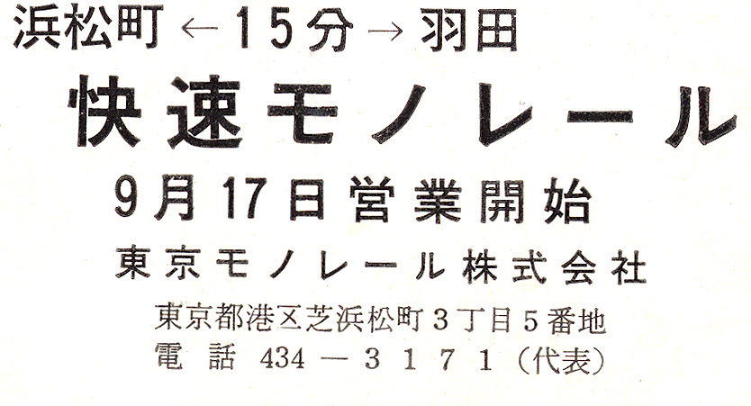 Tel: 434 – 3171 (main line)“… The distance between Tokyo International Airport and the city centre was cut to a great extent when a double track monorail was inaugurated in September last year (1964) by the Tokyo Monorail Company.