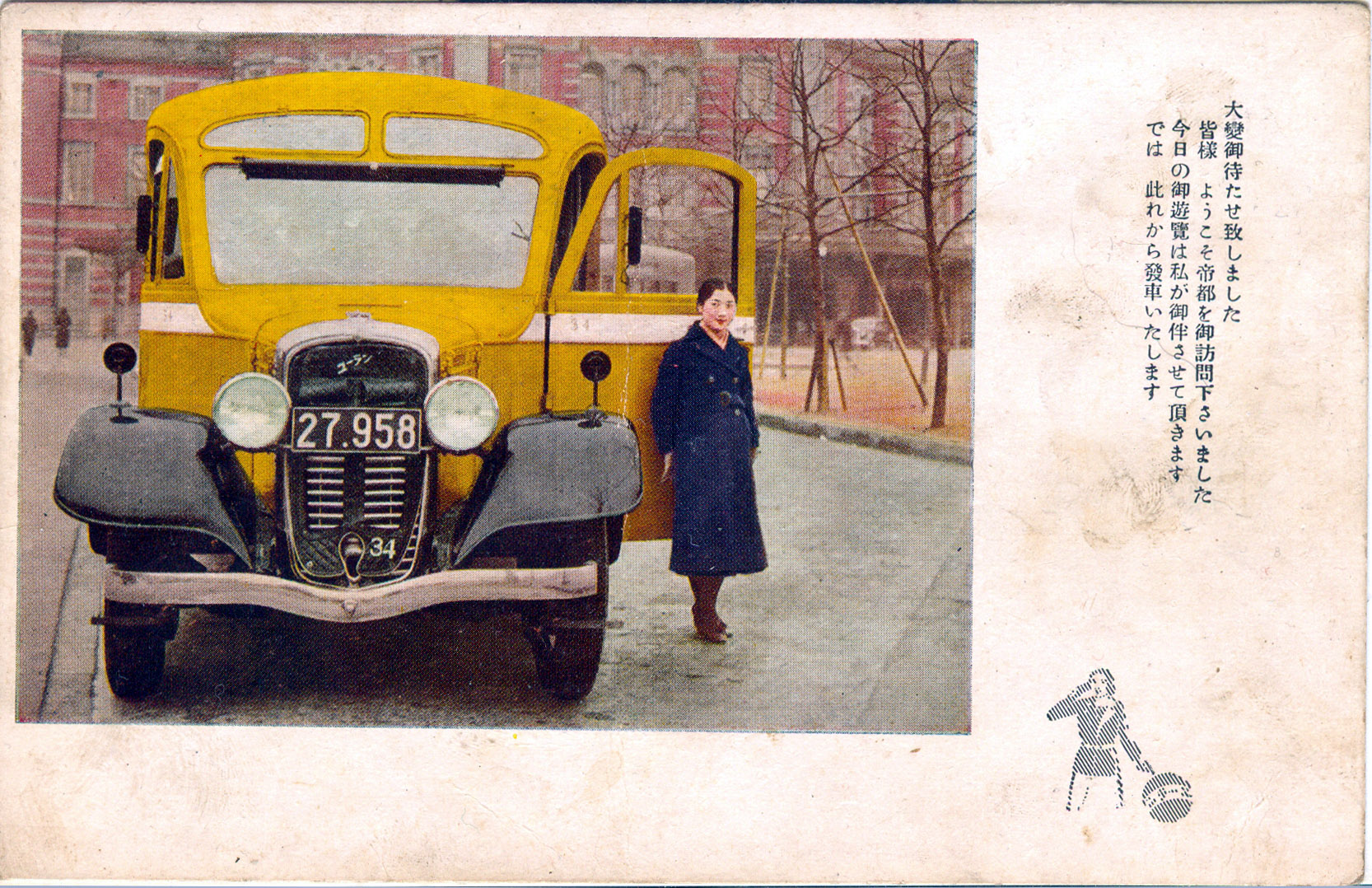 A Tokyo Motorbus Company “Yellow Bus” yuuran [sightseeing] bus (possibly a model 1937 Chevrolet), with a bus guide, outside Tokyo Central Station, c. 1940.